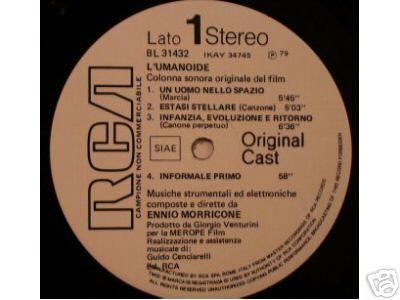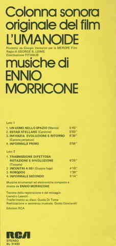 BY ENNIO MORRICONE TRACKLISTING: SIDE 1 1 - UN UOMO NELLO SPAZIO 2 - ESTASI STELLARE 3 - INFANZIA EVOLUZIONE E RITORNO 4 - INFORMALE PRIMO SIDE 2 1 - TRANSMISSIONE DIFETTOSA ROTAZIONE E RIVOLUZIONE 2 - INCONTRI A SEI 3 - ROBODOG 4 - INFORMALE FILM MENU * HOME PAGE * GALLERY MENU |