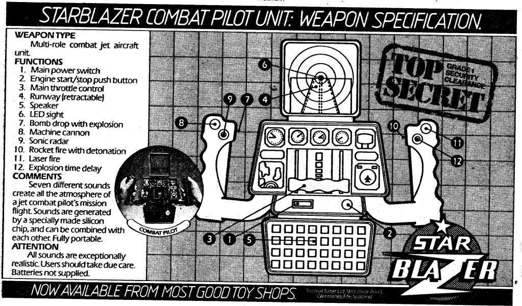 The UK's Thomas Salter toy company produced a range of electronic space toy products under the StarBlazer banner. Possibly the highlight of the range is the elusive Electronic Phazer Duelling Pistols, pictured above, as featured in a promotional product catalogue. Pictured below, and to the right >>> another 1981 Treasure, the Starblazer Combat Pilot simulator, letting wannabe space cadets set controls for the heart of the sun, blasting them into hyperspace for a vast and distant galaxy, an adventure for all time.... !!! |